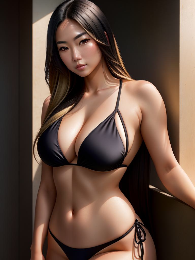 teddi Mansueto, Photo of a beautiful modern asian lady, black hair with blond highlights, wearing a bikini, subtle makeup, cleavage, long hair, photorealistic, high contrast, 8k HD, detailed, hyper-detailed, best quality, ultra high resolution, raw photo, dramatic lighting, unreal engine, diffuse glow, sexy